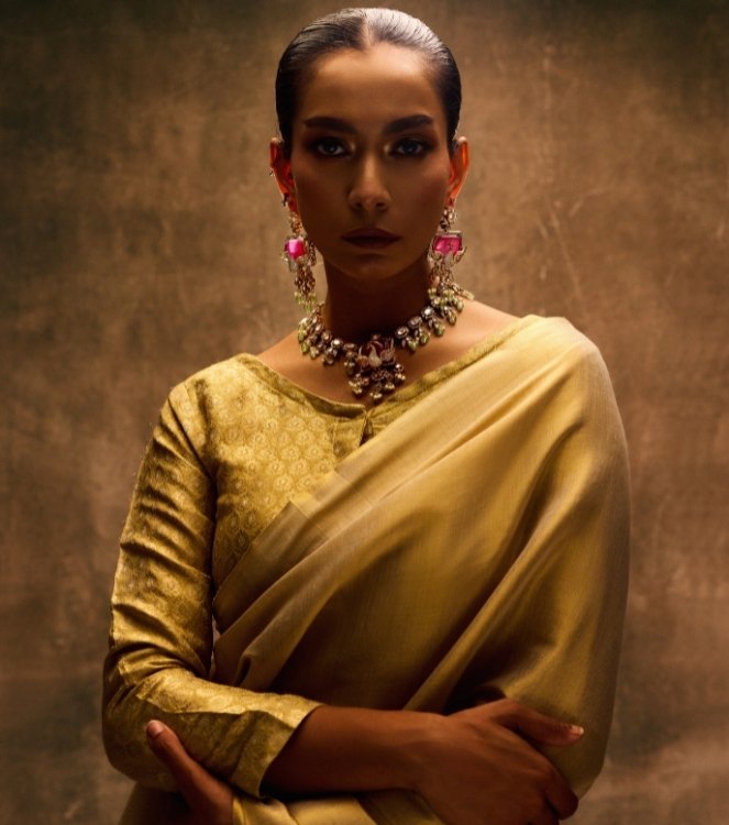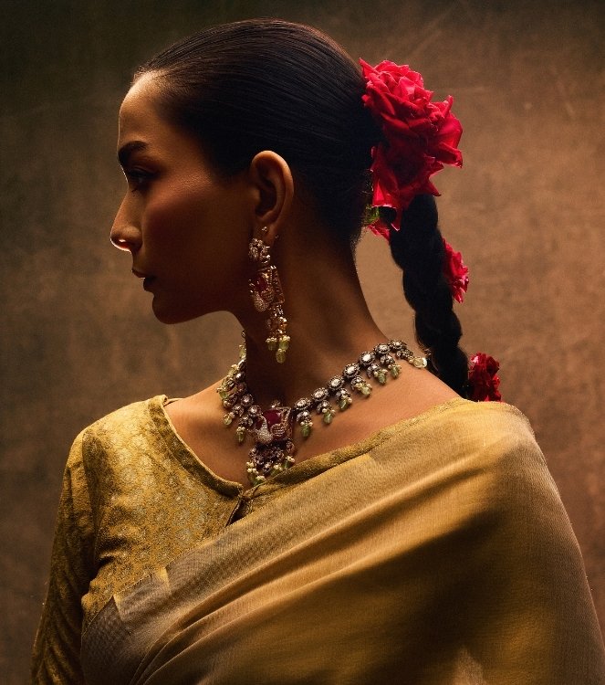 An opulent masterpiece that celebrates regal artistry, this necklace exudes the grandeur of Mughal inspired design. At its heart rests a majestic bird motif, finely enameled against a rich crimson stone, symbolizing grace and sovereignty. The intricate framework is encrusted with brilliant kundan-set polki moissanites, each stone radiating old-world brilliance. Cascading drops of soft green gemstones, paired with delicate seed pearls, add a refreshing contrast to the warm golden hues, evoking the splendor of royal treasuries. Bold yet refined, this necklace is a statement of heritage and timeless elegance.