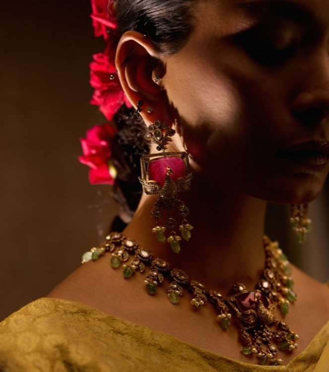 Echoing the regal splendor of the necklace, these statement earrings are a poetic blend of heritage and refinement. Each piece showcases a majestic bird motif set against a vivid crimson enamel backdrop, symbolizing grace and power. Intricately detailed with kundan-set polki moissanites, the earrings shimmer with timeless brilliance. Cascading drops of soft green gemstones and dainty pearls create a delicate movement, balancing grandeur with elegance. Bold yet feminine, these earrings are designed to frame the face with an aura of royal sophistication.