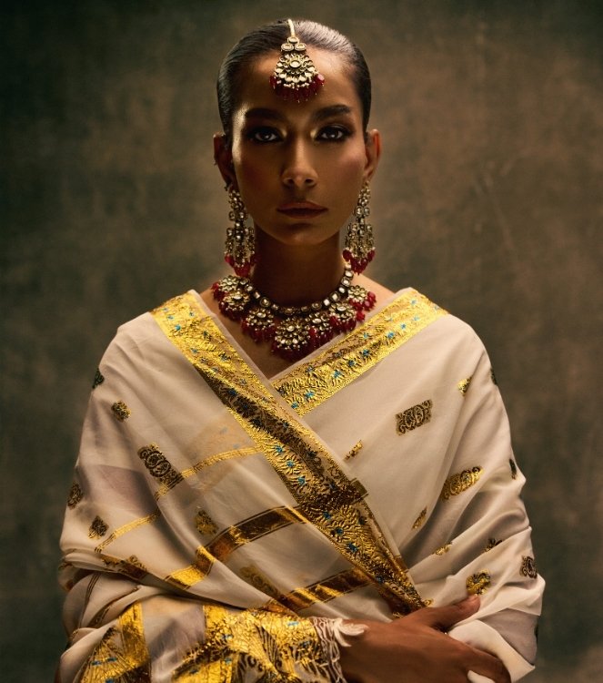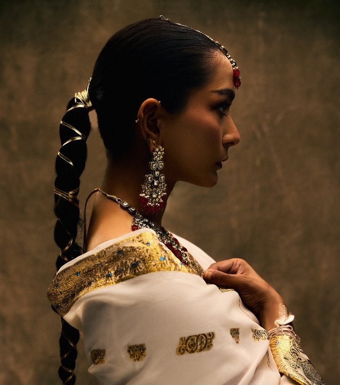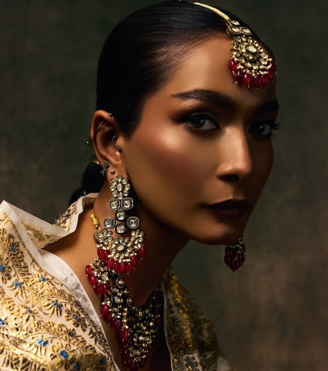 Completing the set, the teeka is adorned with radiant moissanite kundan craftsmanship and crowned with ruby drops. Resting gracefully on the forehead, it adds a touch of majesty and tradition, transforming the look into one of timeless elegance.