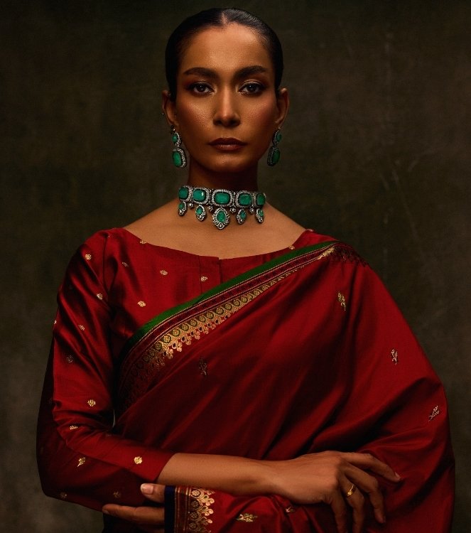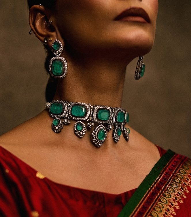 Set in a richly textured silver-toned base, the choker exudes timeless sophistication, making it a statement of opulence.